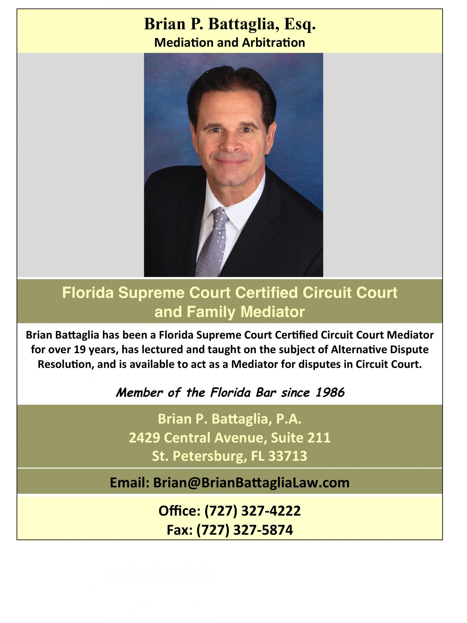 The Law Office of Brian Battaglia P.A. provides mediation in St. Petersburg to assist in resolving disputes that can interfere with your business or life in general. Brian is a Florida Supreme Court Certified Circuit, County and Family Mediator. Brian Battaglia has taught Alternative Dispute Resolution at Stetson University College of Law and has significant experience handling complex civil litigation matters in state and federal court. Brian has also successfully argue before the Florida Supreme Court and was previously recognized and received the Sixth Judicial Circuits Pro Bono Service Award. He has also been president of the Community Law Program. Brian’s office is located at 2429 Central Avenue, Suite 21, St. Petersburg, Florida 33713. Brian’s office phone is 727-327-4222.